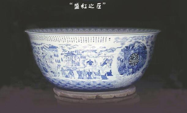 该碗是由盛虹集团董事长缪汉根先生提出创意并邀请众多专家教授历时两年共同创作完成的。图案采用青花特征,精细地绘制了丝绸之路陆路和海路的图形,其中有人物56个,象征华夏56个民族;海路描绘郑和下西洋盛景,栩栩如生。该碗铭文结合文化和地域特点,288个铭文分72节,象征孔子72贤人,盛泽72弄、盛泽垂虹桥72孔。