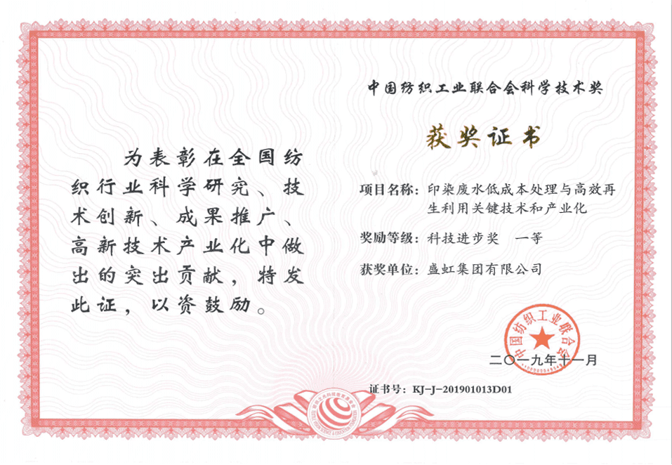 12月6日下午,“纺织之光”2019年度中国纺织工业联合会科技教育奖励大会在北京人民大会堂隆重举行。科技成果带动产业创新,盛虹集团交出一份靓丽的成绩单。以盛虹为第一完成单位完成的“印染废水低成本处理与高效再生利用关键技术和产业化”项目获得了中国纺织科学技术进步一等奖!