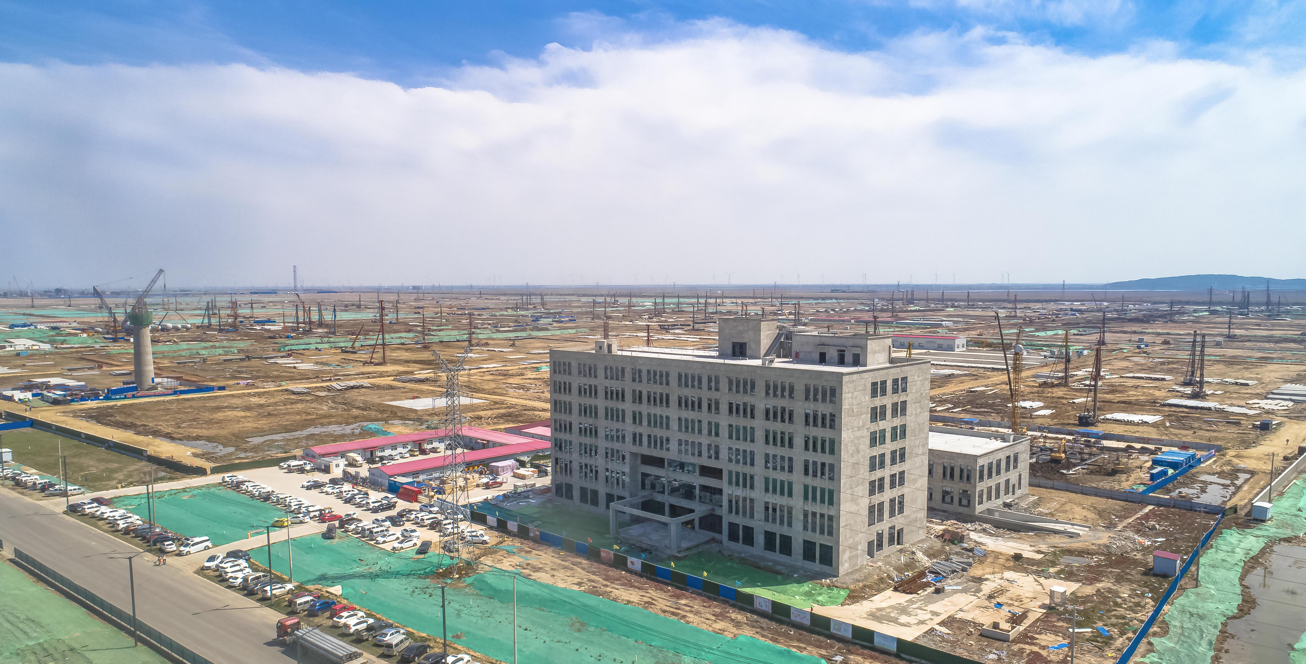 建筑物:综合办公楼及职工食堂正在内部装修;生产办公楼正在进行基础浇筑;各机柜间、变电所等33个建筑单体正在进行基础施工。