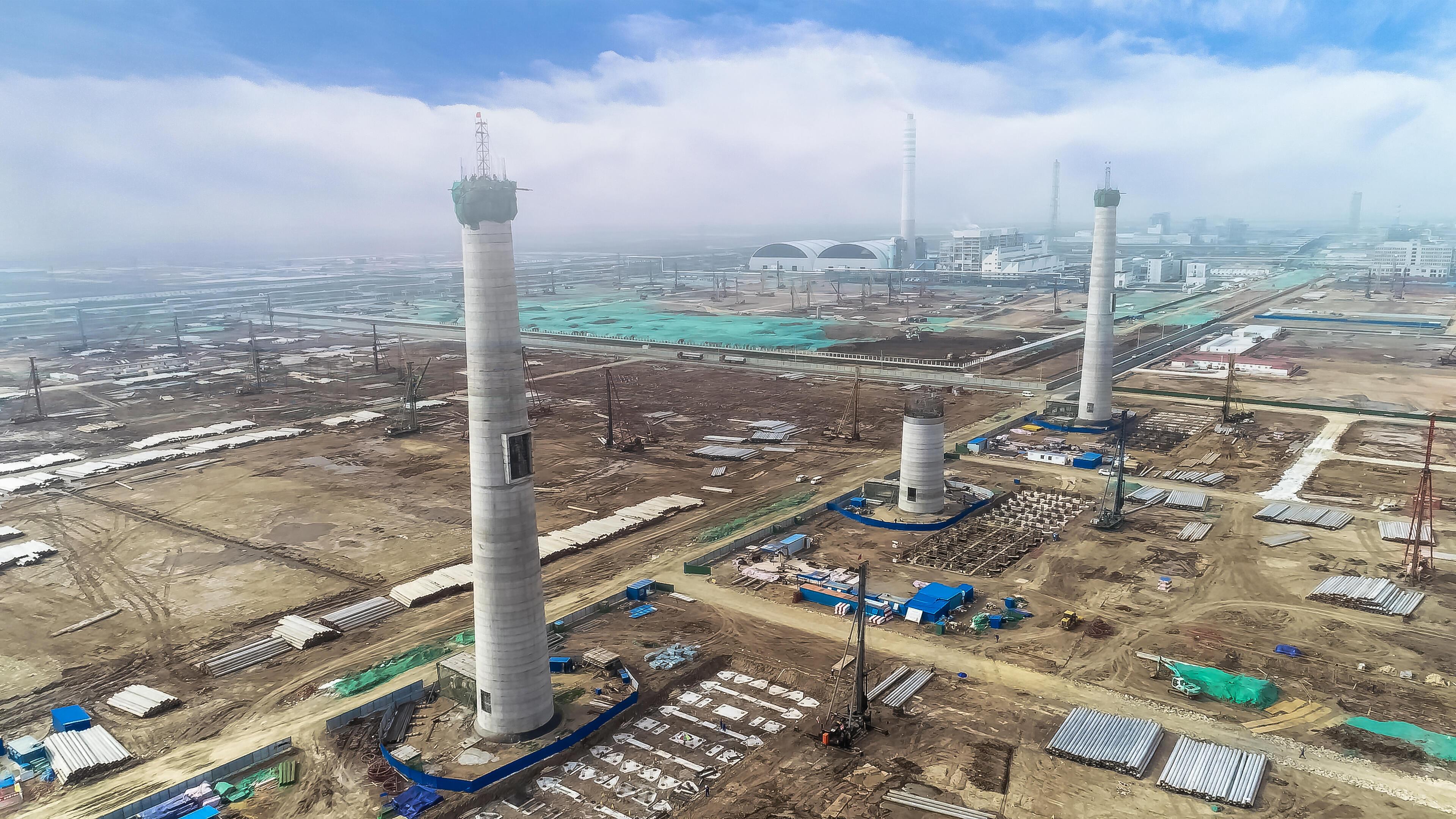 混凝土烟囱:全场13个烟囱土建基础基本完成,目前正在进行筒体施工,其中1#、3#重整烟囱已施工至85米。