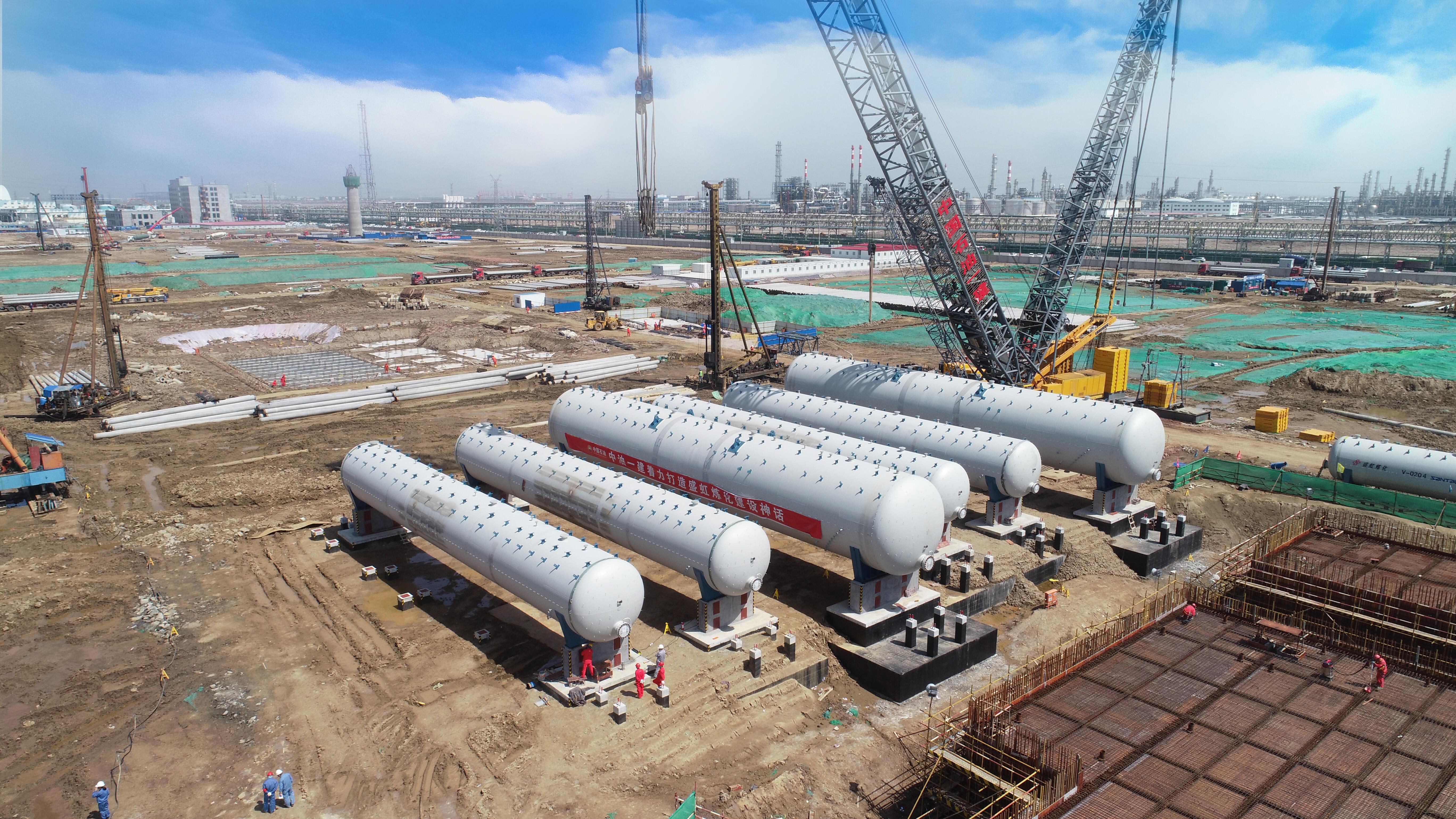 5月13日,1600万吨/年常减压蒸馏装置三级电脱盐罐吊装完成,即将启动常压炉、减压炉等装置吊装。