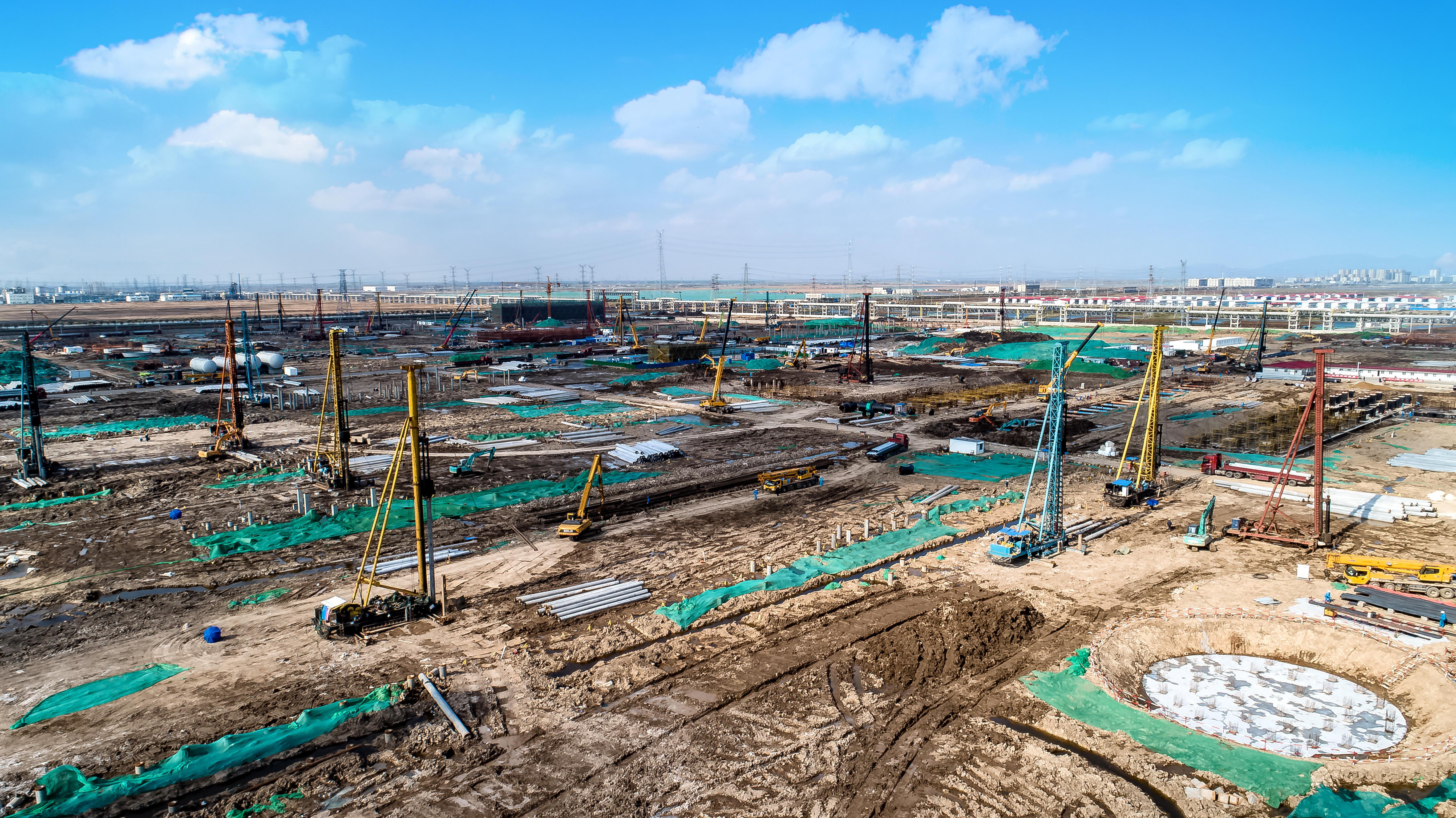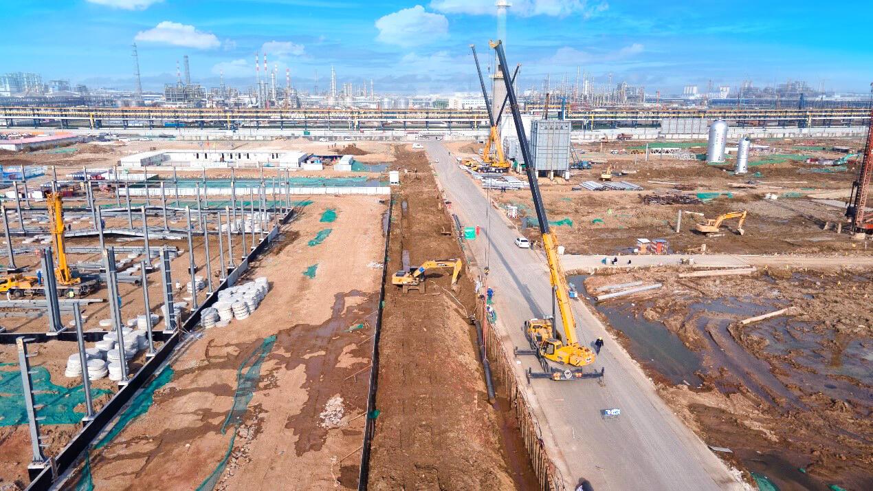 在连云港石化产业基地,盛虹炼化一体化项目上万名建设者正开足马力,同步加快各项施工。