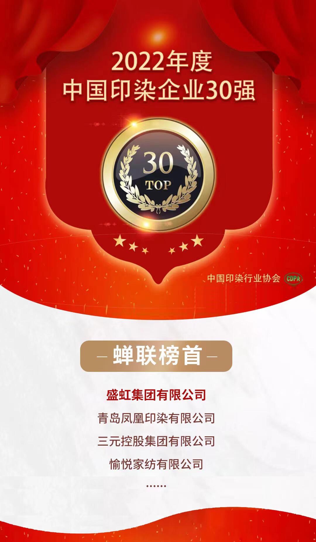 7月14日,中国印染行业协会六届六次理事扩大会议暨六届九次常务理事会在浙江绍兴成功召开,会上发布了“2022年度中国印染企业30强”名单。盛虹集团有限公司位居榜首,持续领跑全国印染行业。