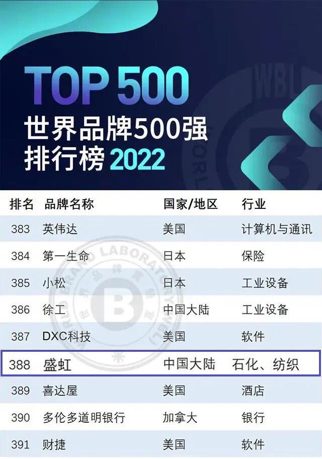 12月15日,2022年《世界品牌500强》排行榜发布,盛虹再次登榜位列第388位,较上年首次登榜上升11位。