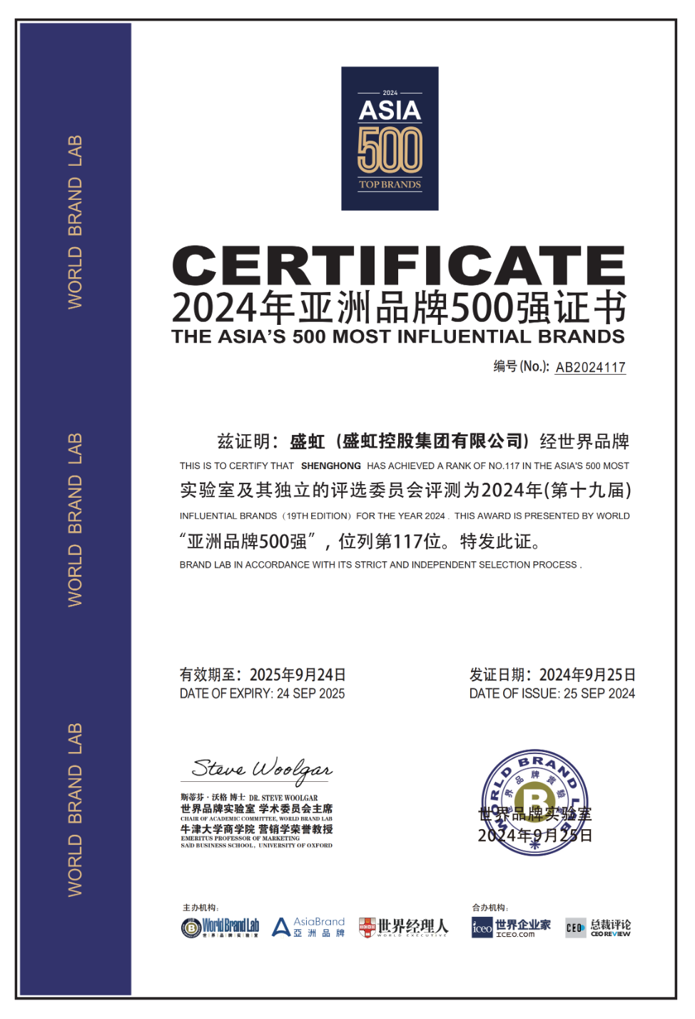 9月25日,亚洲品牌大会在香港召开。主办方世界品牌实验室(World Brand Lab)在会上发布2024年(第十九届)《亚洲品牌500强》年度报告。盛虹控股集团连续5年上榜,位列亚洲品牌500强第117位,较去年提升了4位,品牌价值稳步攀升,品牌影响力持续扩大。